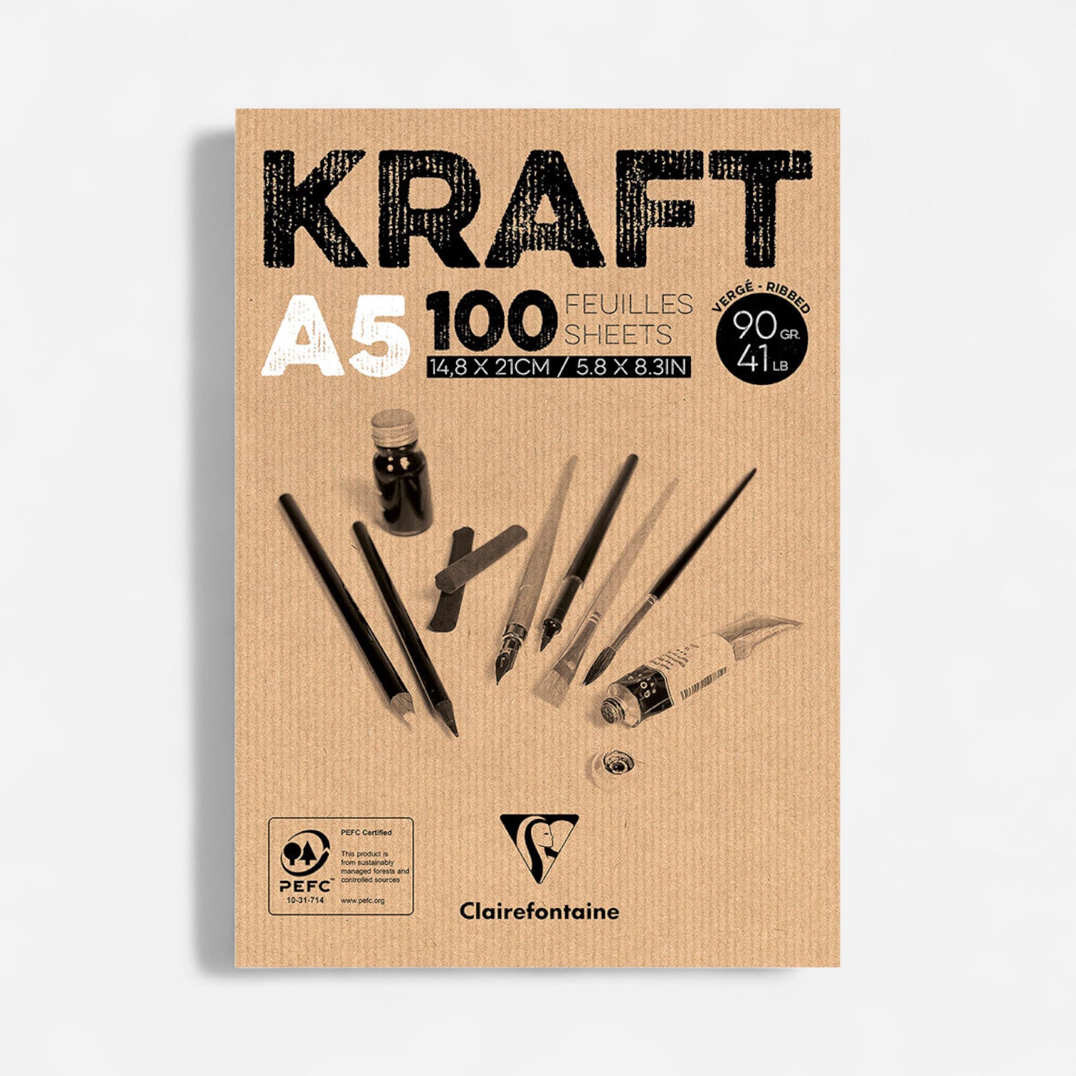 This machine-glazed kraft paper has an attractive appearance, with one side smooth and shiny and the other matte. The ribbed paper is very similar to the Ingres and laid paper. It is made with long, natural, unbleached virgin fibers. It is 100 percent natural and also 100 percent biodegradable and recyclable. Its unique mechanical strength, flexibility and printability enable various uses either in drawing in dry techniques and inks on its smooth, resistant surface. A4 size. 90gsm weight kraft paper. 100-sheet glued pad.