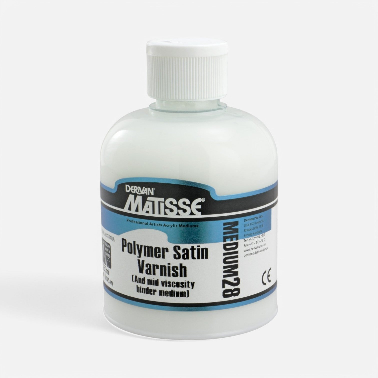 MM28 Polymer Satin Varnish is a water-based acrylic varnish containing matting agents to reduce sheen, resulting in a satin finish which is not too glossy but still has a lively look about it without being matt. MM28 Polymer Satin Varnish will help to bring out the intense, vibrant colours of the Matisse Professional Artist Acrylics range. Use as a final varnish over a dried, well-cured acrylic painting where a satin or semigloss sheen is required (and the use of MM29 Final Varnish Satin Finish (Turps-based) is not appropriate).