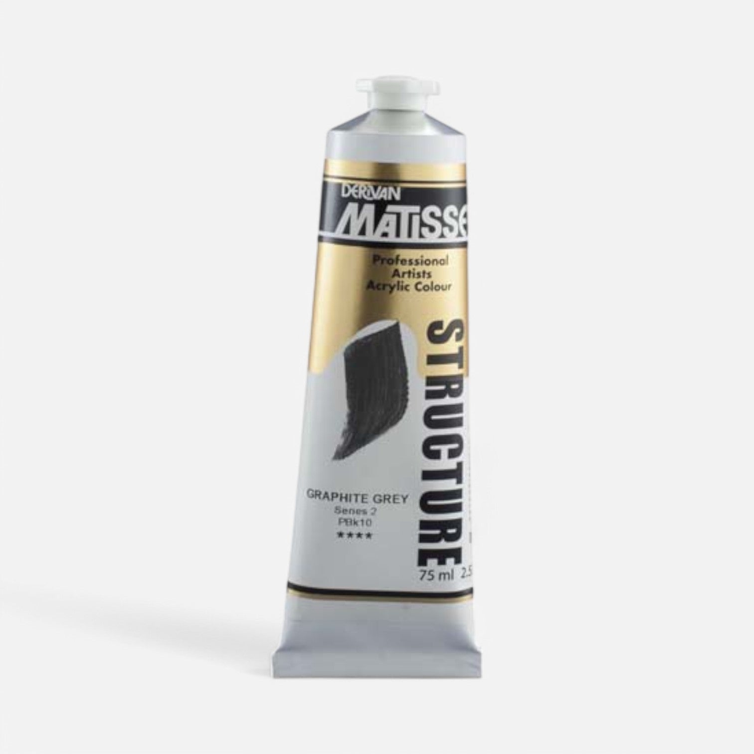 Matisse has used graphite pigment to create the unique tone of Graphite Grey acrylic paint with a slight bluish, cool quality. It also has a very subtle graphite iridescent finish when dry.