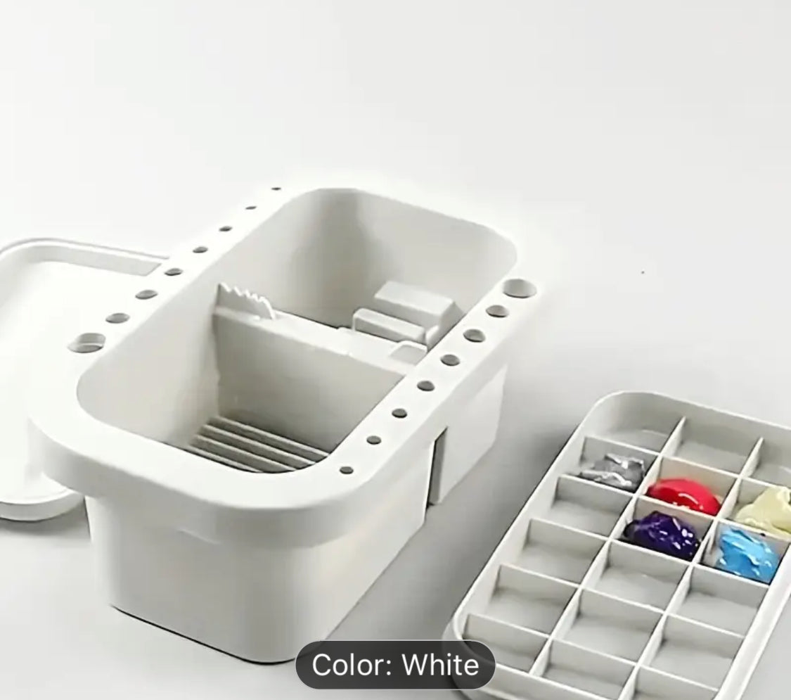 Paint palette and brush-wash station. Made from translucent, impact resistant plastic.